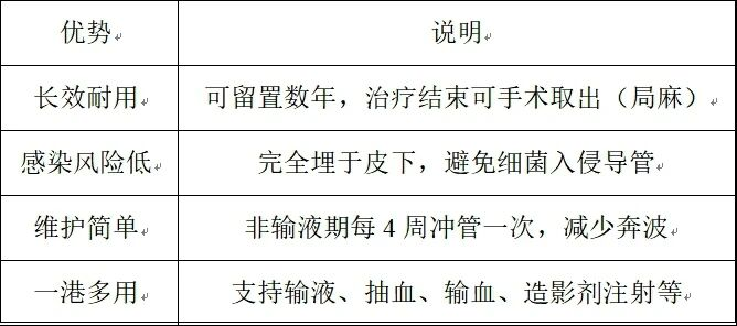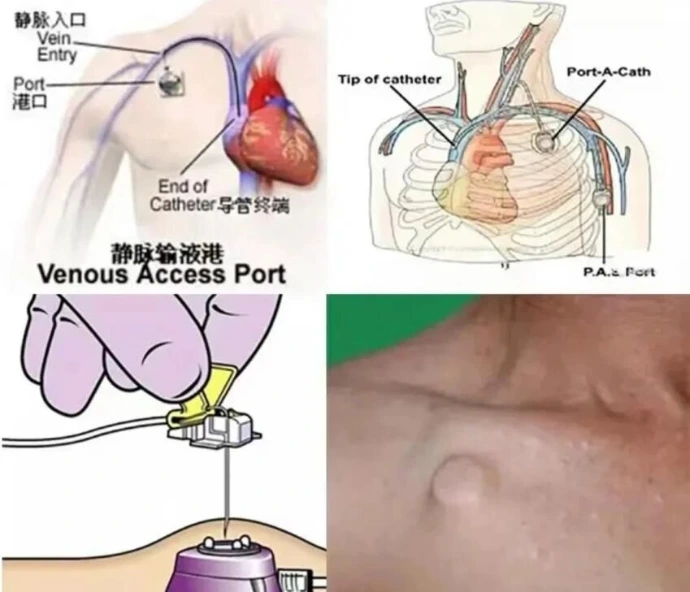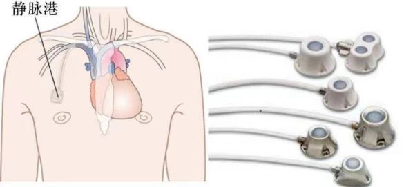 工作原理:港体埋在胸前或上臂皮下,导管连接大静脉(如上腔静脉),输液时用专用无创针穿刺港体即可。