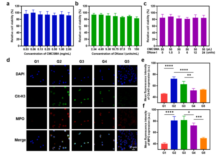 图2:体外CMCSMA/DNase I凝胶浸提液的细胞毒性评估与介导的NETs降解验证