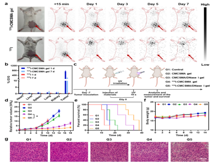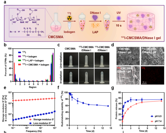 1. 材料学构建与双效释药机制:设计并表征了基于甲基丙烯酰化羧甲基壳聚糖(CMCSMA)的光固化水凝胶。通过Iodogen法共价标记同位素131I并物理包埋DNase I,奠定“同位素原位锚定”与“生物酶长效缓释”的物理载体基础。