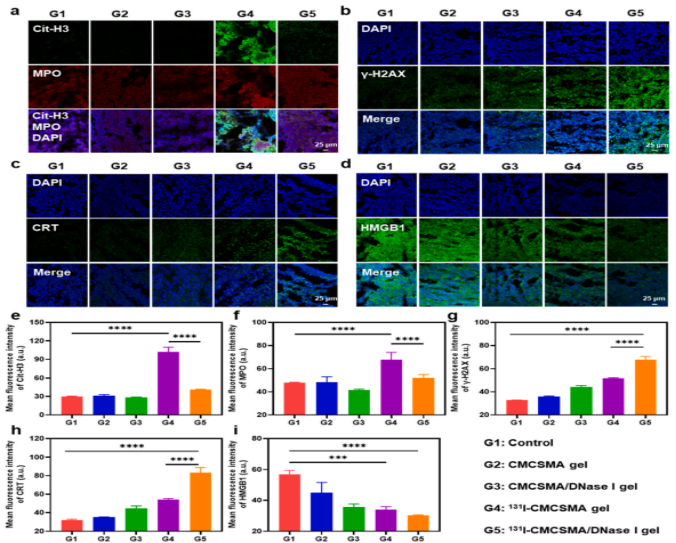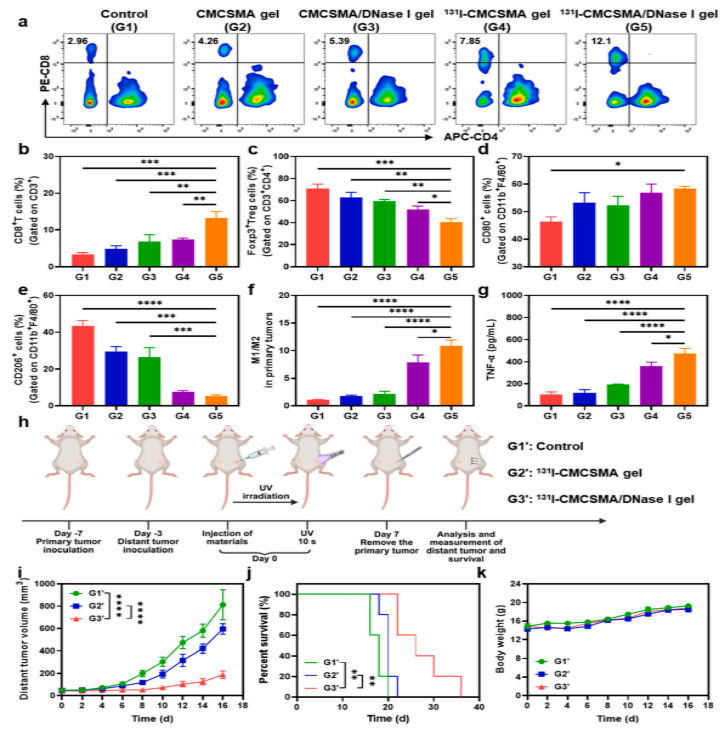总体归纳:研究构建了131I-CMCSMA/DNase I 双效原位水凝胶平台,在成功规避核素系统性毒性及流失的前提下,系统确证了DNase I介导的NETs靶向降解效能。结合组织微环境表征、免疫细胞流式组学及远端肿瘤干预终点,建立了“局部长效放疗—靶向降解NETs—CD8+ T细胞/M1巨噬细胞依赖的系统性远隔效应”的完整证据链闭环。